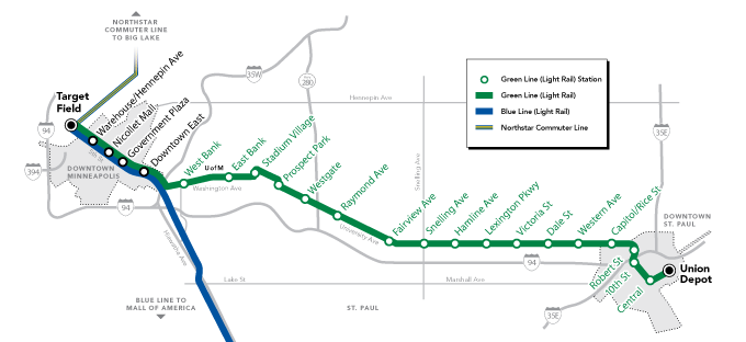 Visit Metro Transit’s Green Line page for information about current service, hours of operation, fares, bus connections, and using the METRO system.