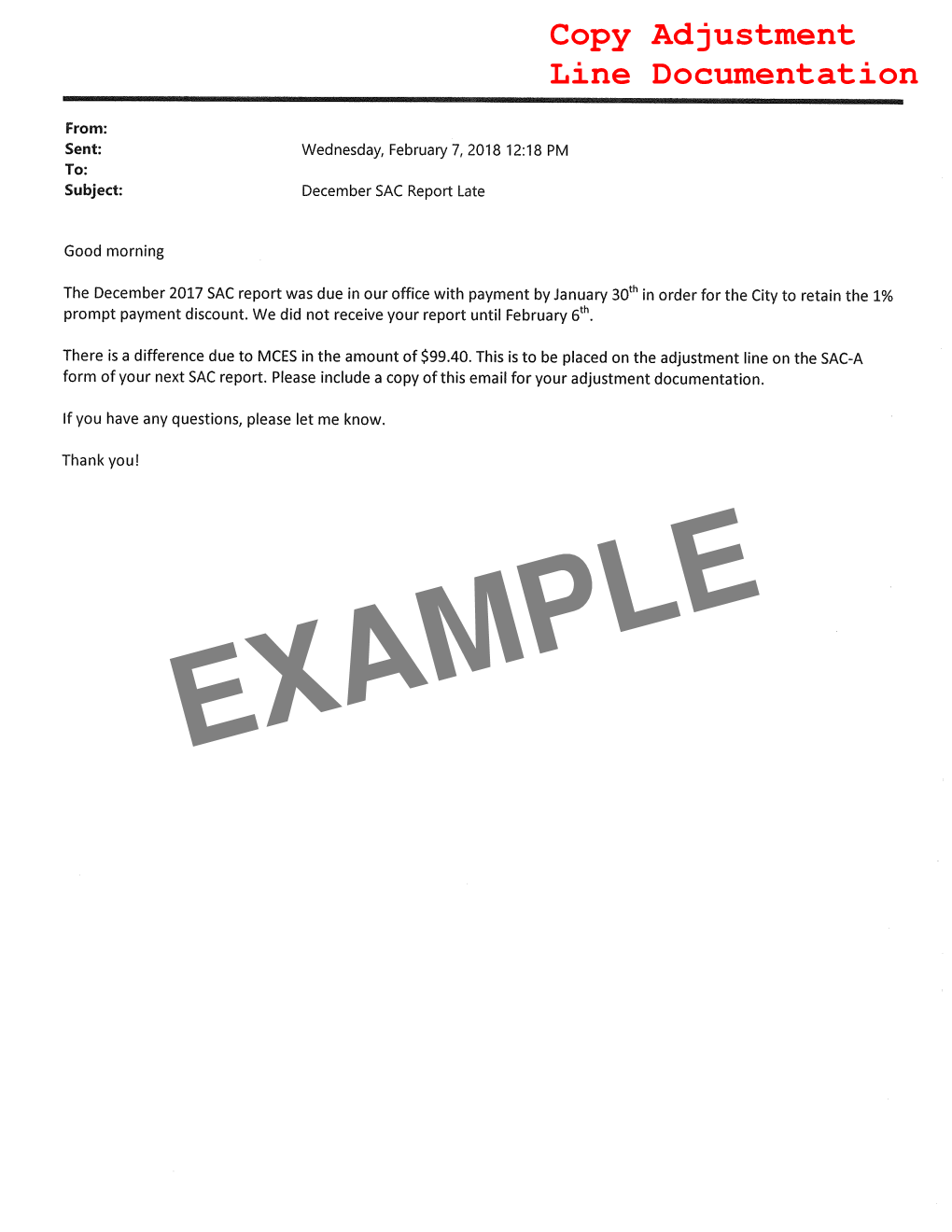 This form is the summary of permit and payment activity for the reporting period. If the payment is not from your current permit activity, the dollar value is entered on the adjustment line (towards the end of the form on right side). See a copy of what can be submitted for your adjustment documentation (80 KB PNG image).